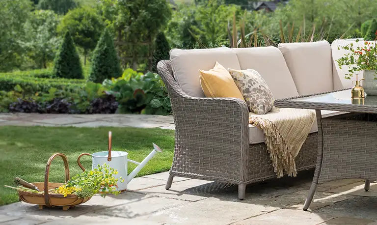 Embrace rattan and wicker for furniture and decor. Rattan furniture in particular can add to the vibe of everything being handmade whilst also being especially great for letting in just enough natural light through its woven details. At Kettler, our rattan furniture uses a synthetic alternative that is protected against the weather and can be left out all year round. From lounge sets to sofas, cushion boxes, armchairs and more, you can deck out your entire patio with premium rattan furniture that will last for many summers to come. We even have a Boho collection inspired by the intricate woven patterns of Moroccan furniture, featuring lounge sets for five, balcony sets for two and dining sets for four. Create cohesion with your rattan furniture with added wicker baskets, and natural materials such as wood, stone and clay pair well, too.