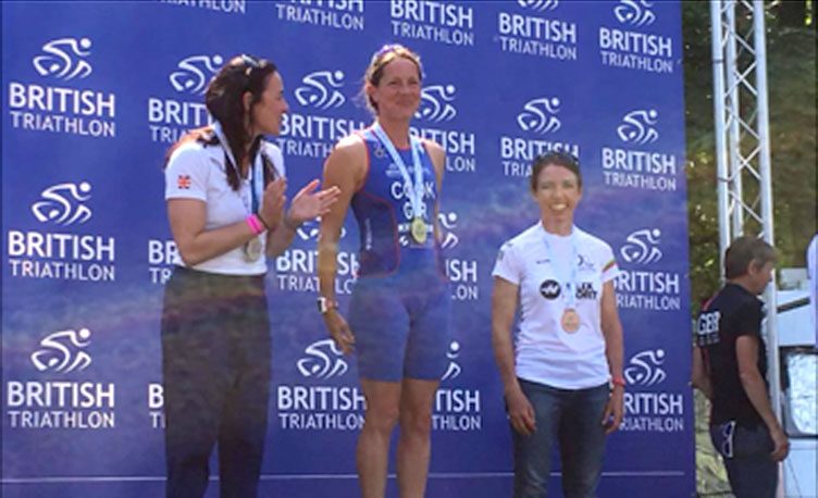 Mireille Cook receiving her Gold medal at the British Triathlon National Championships.