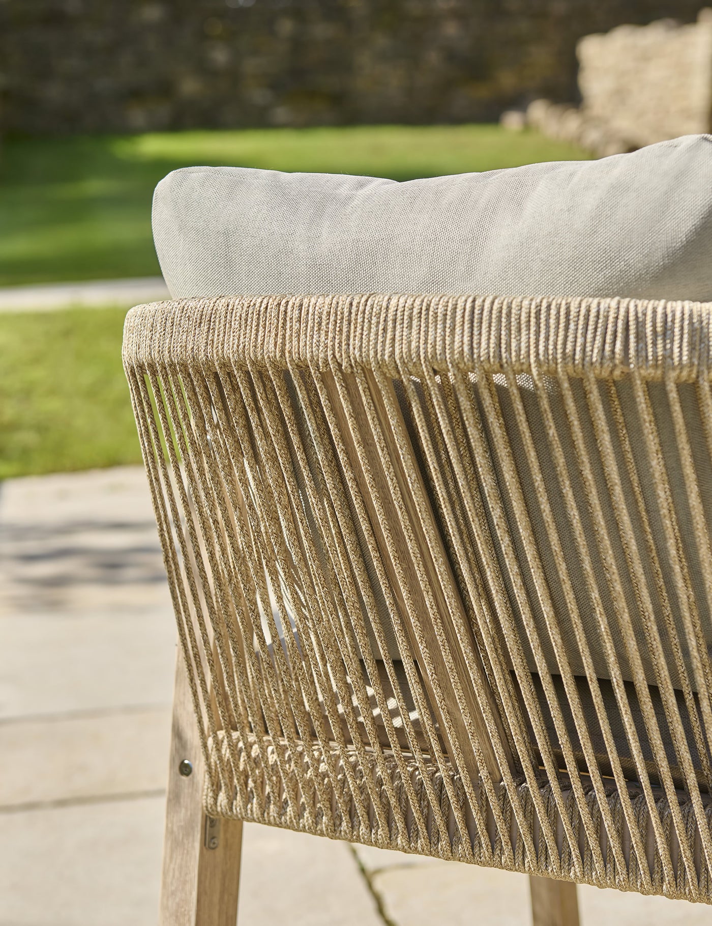 It’s complemented by eight high-back rope chairs, expertly handwoven with UV-resistant synthetic rope and finished with plush, stain-resistant cushions for superior comfort. Whether hosting family feasts or summer celebrations, the Cora 8-seat set delivers lasting durability, comfort, and a cohesive look that effortlessly enhances your garden or patio.