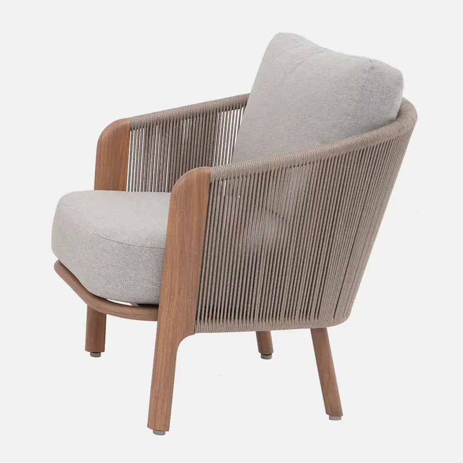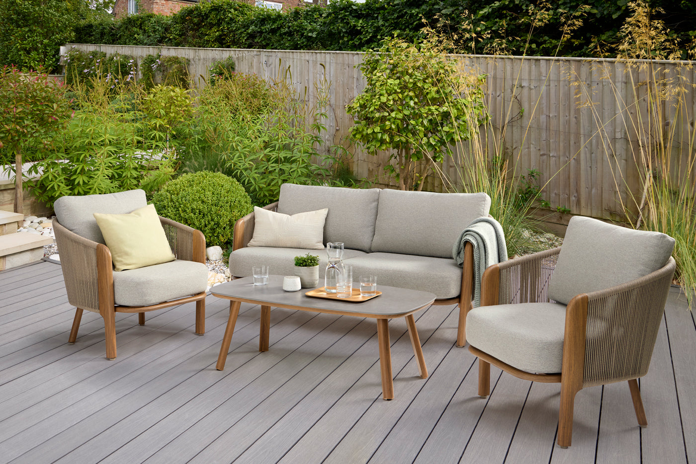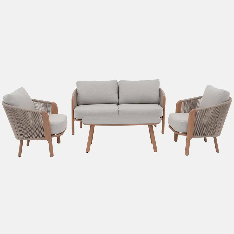 Improve your outdoor oasis with the Cres Lounge Set, a stunning blend of comfort, style and practicality. Crafted with a lightweight aluminium frame that features a sophisticated wood effect heat transfer, this lounge set is designed for modern living. The all-weather rope enhances durability while adding a contemporary touch to your space.