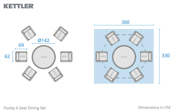 The set is built on a robust powder-coated aluminium frame and finished with 4mm full-round, UV-resistant hand-woven synthetic wicker, giving it a refined appearance alongside long-lasting durability. The slatted tabletop is sunk to create a flat, secure surface, while adjustable feet help level the table on uneven ground. Finished with KETTLER RainSafe cushions that dry more quickly after showers, the Foxley 6-Seat Dining Set offers an easy-care solution for relaxed outdoor dining all season long.