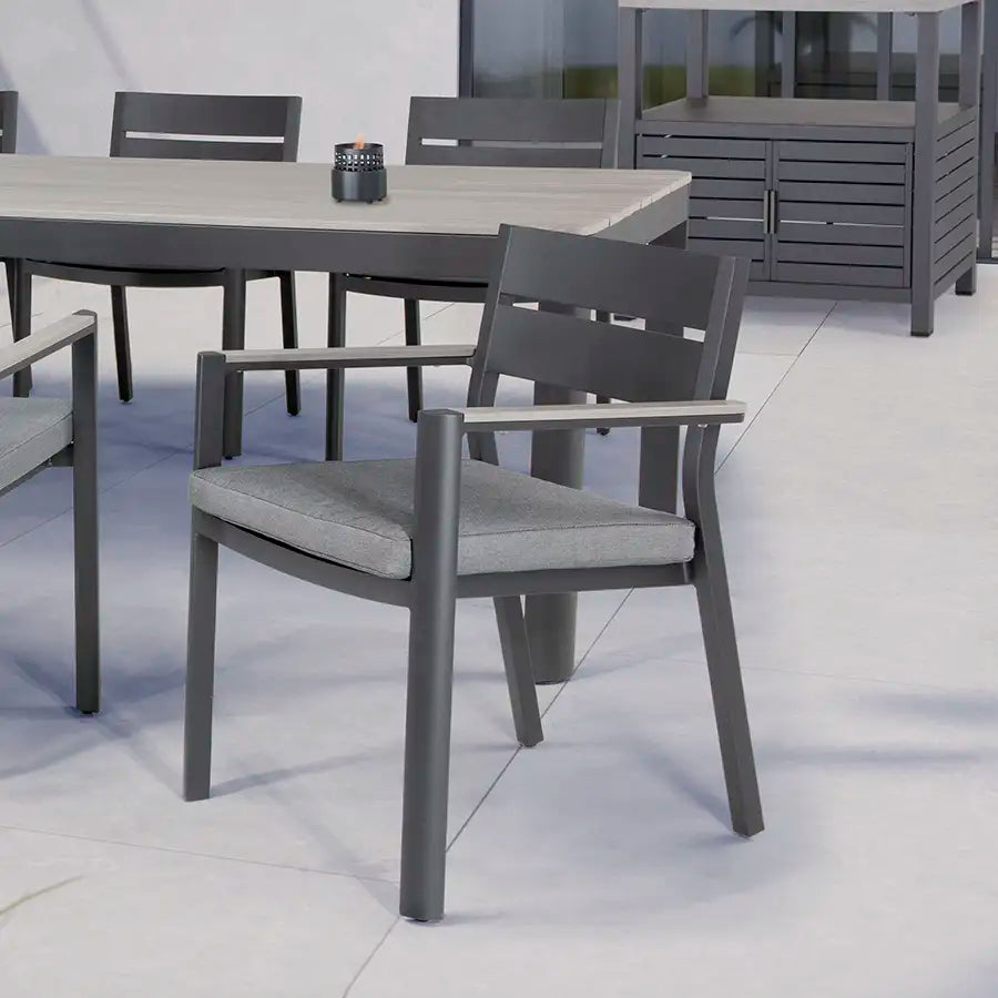 This set features the Gio Dining Table and six matching Gio Dining Chairs, crafted from durable aluminium alongside a wood-effect tabletop and armrests. The teak-effect finish of the chairs complements the table perfectly, creating a harmonious haven for all your al fresco dining experiences.