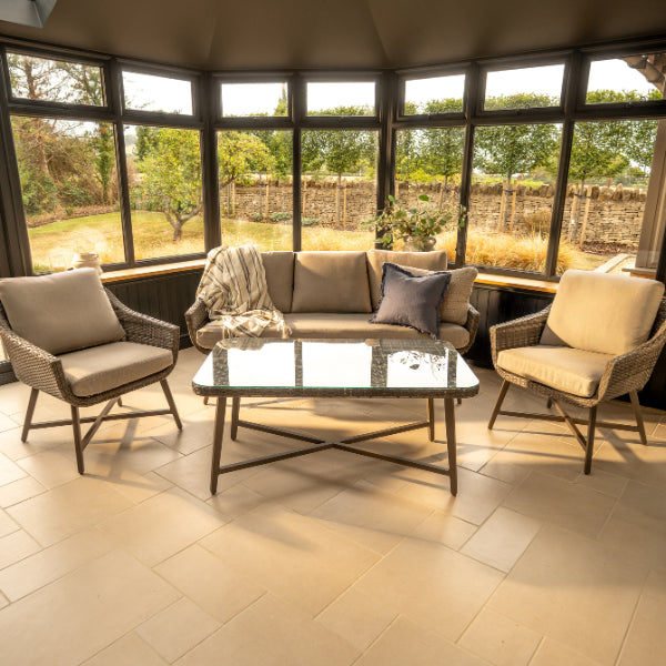 Relax in style whether you're bringing the indoors out or the outdoors in, this lounge set is suitable for both your garden and conservatory. The bucket style sofa and chairs give the ultimate relaxation you need with a place to put your drinks and snacks on the coffee table.