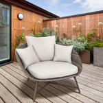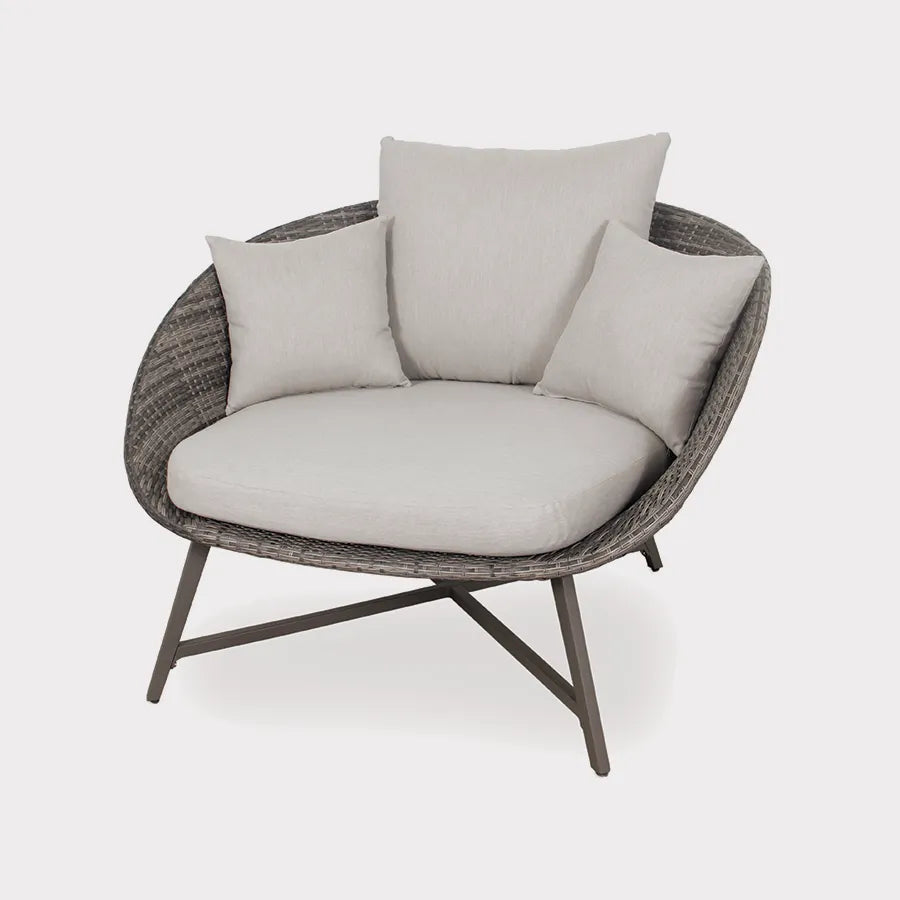 The synthetic wicker is handwoven onto an aluminium frame. The frame is weatherproof and rustproof, lightweight yet robust. The LaMode Comfort Chair includes back and side cushions in stone. The bucket shape seat allows you to sink into the cushions and snuggle into the chair.