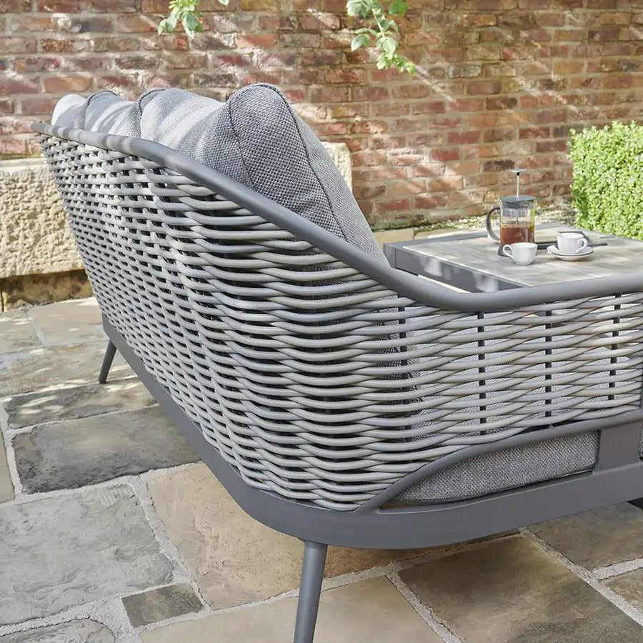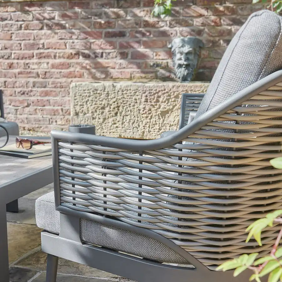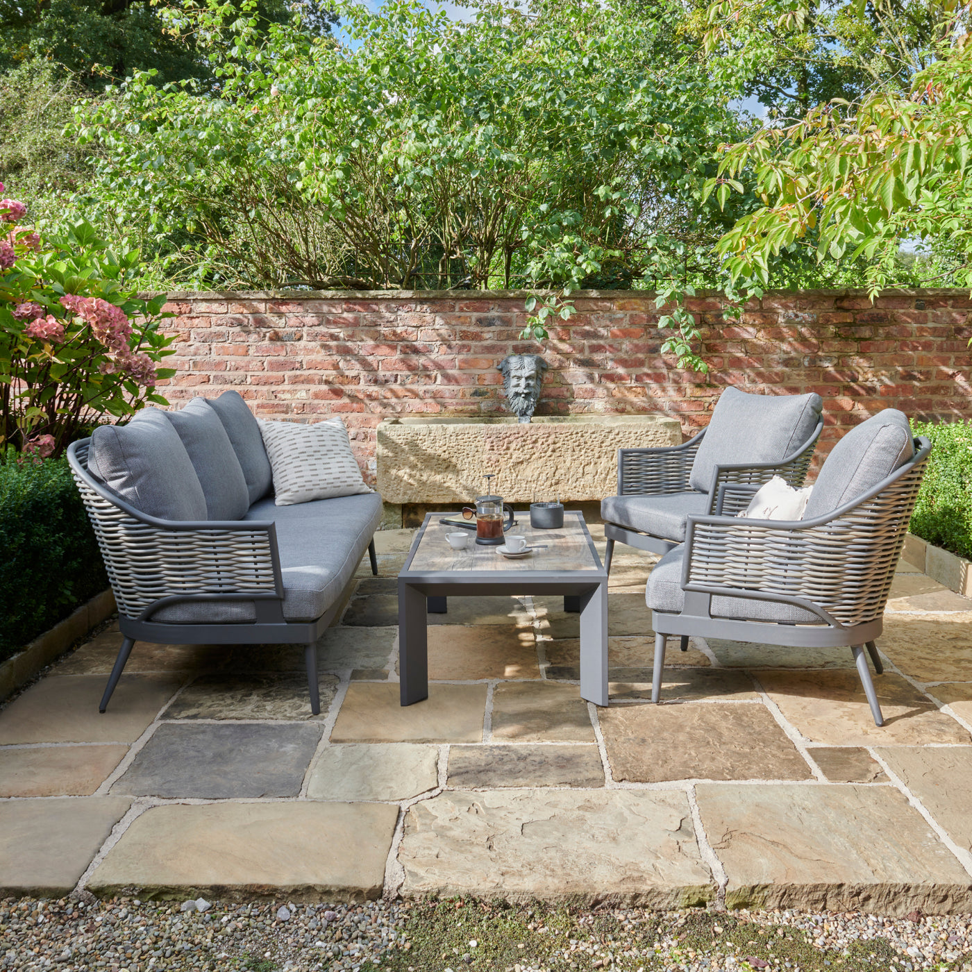 Much like the Malo six-seater dining set, this lounge set features a distinctive design that delivers comfort, durability and style in abundance. Both the chairs and the table are crafted from powder-coated aluminium, a hard-wearing material chosen for its strength and corrosion resistance. The chairs feature hand-woven synthetic rattan and supple weatherproof cushions, offering plenty of comfort, while the table is finished with an attractive ceramic slat top.