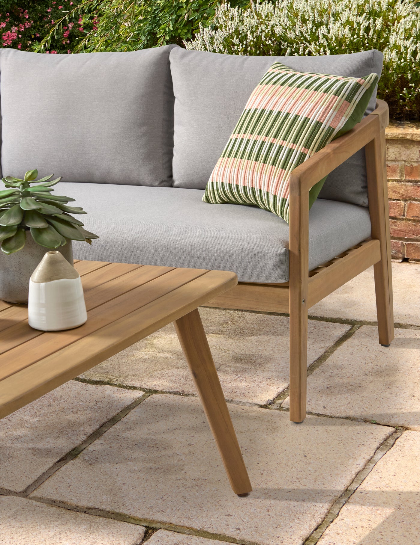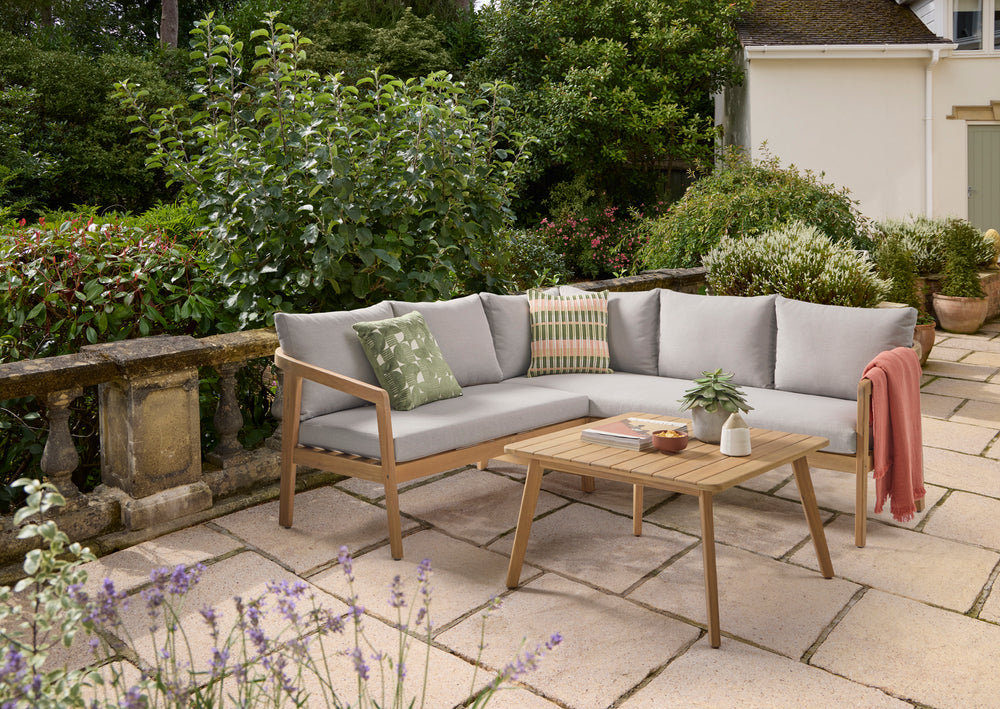 Upgrade your outdoor living space with the exquisite Nara Corner Set, designed to blend comfort and style seamlessly. Crafted from 100% FSC acacia wood, this set not only showcases a stylish aesthetic but also embodies sustainability. The elegant pebble-coloured cushions add a touch of contemporary charm, creating a warm and inviting atmosphere for gatherings with family and friends.