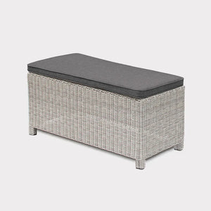 In a whitewash with grey taupe cushions a matching glass-top table, armchair and bench are available for an even more accommodating garden furniture set.