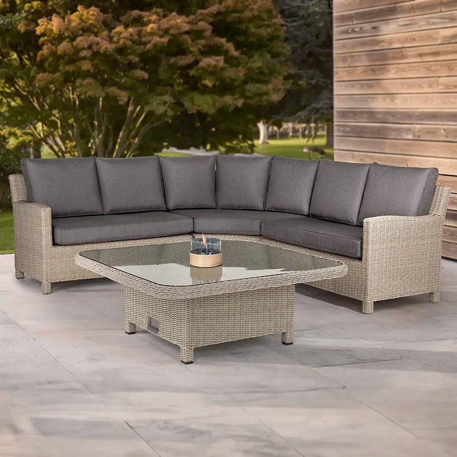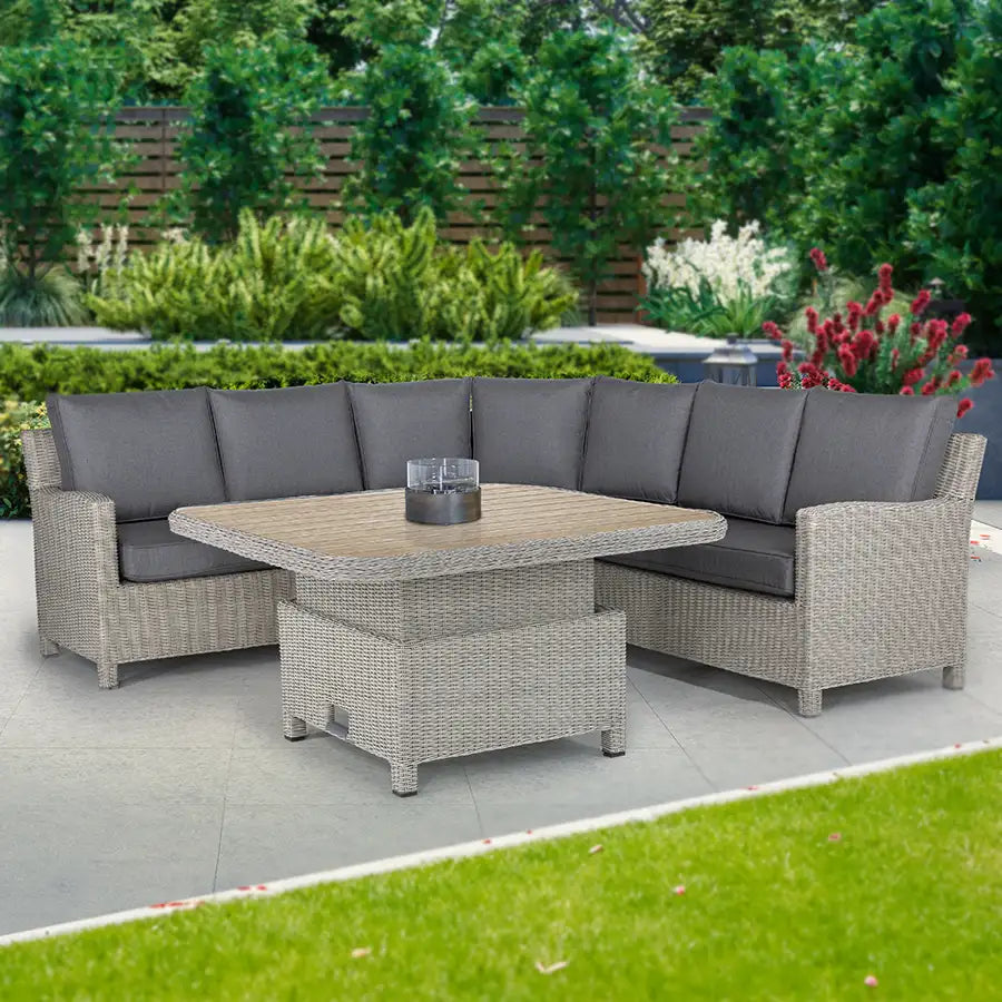 The largest and most spacious set in the Palma collection, the Signature Grande set includes a seven-seater Palma corner sofa and a High/Low table that can be raised and lowered to become a dining table or coffee table. This allows you to lounge and dine all on one set, and the symmetrical design works in any orientation to utilise the space on your patio area, decking or even conservatory.