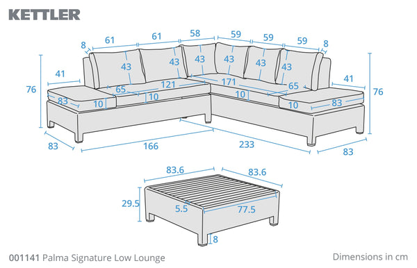 Spread out on the stylish Palma Signature Low Lounge set, which is durable, comfortable and easy to clean. This contemporary set includes a 5-seat corner lounger, with plush, waterproof cushions and a square aluminium slat coffee table.