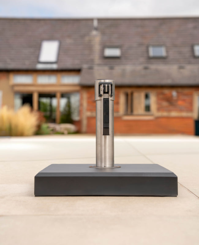The stainless-steel collar system allows the parasol pole to click securely into place with a simple push-and-release action. Once positioned, a robust locking lever reduces movement and enhances stability. A built-in hand hole makes this garden parasol stand easier to lift and reposition as required.