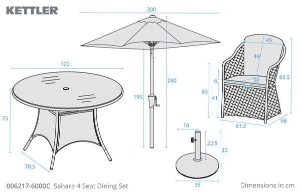 The set includes four Sahara dining chairs, each finished with comfortable weatherproof cushions, alongside a 120cm round dining table topped with sleek ceramic glass and complete with a matching parasol and base for added shade. Crafted from a strong powder-coated aluminium frame and hand-woven using a mix of 3mm and 4mm full round, UV-resistant synthetic wicker, the Sahara Dining Set delivers durability, comfort, and timeless appeal.