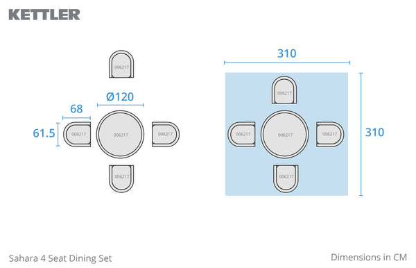 Designed for everyday outdoor living, the cushions feature KETTLER RainSafe® technology, repelling rain and drying faster after showers — ideal for spring and summer use. The ceramic glass tabletop is recessed to create a completely flat, secure surface, while adjustable feet ensure stability on uneven ground. The furniture can be left outdoors all year round (excluding cushions), with optional protective covers available. Complete your outdoor space with coordinating pieces from the Sahara range, including lounge and additional dining options, for a cohesive garden setting.