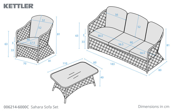 Comfort is at the heart of the design, with cushions featuring an 8cm foam core and refined double piping to help retain their shape over time. Finished with KETTLER RainSafe® technology, the cushions repel rain and dry faster, making them ideal for spring and summer use. The ceramic glass table top is recessed for a smooth, secure finish and includes adjustable feet for uneven surfaces. The furniture can be left outdoors all year round (excluding cushions), with optional protective covers available. Complete the look with coordinating pieces from the Sahara range, including dining and additional lounge options, for a cohesive outdoor setting.