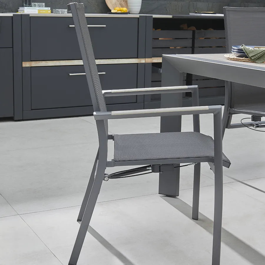 The lightweight, powder-coated aluminium frame ensures durability, while the bouncy Textile Sling seat and back offer cushion-free comfort. The wide armrests, made with FSC® certified teak wood slats, add an elegant touch. The multi-position reclining chairs allow you to adjust your seating for ultimate relaxation. Designed to be weatherproof and rustproof, this set can be left outdoors all year round. Whether you're hosting a small family meal or enjoying an alfresco gathering, the Surf 4 Seat Dining Set provides a stylish and durable solution.