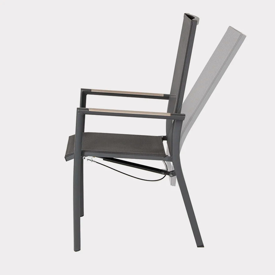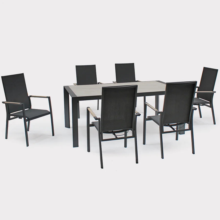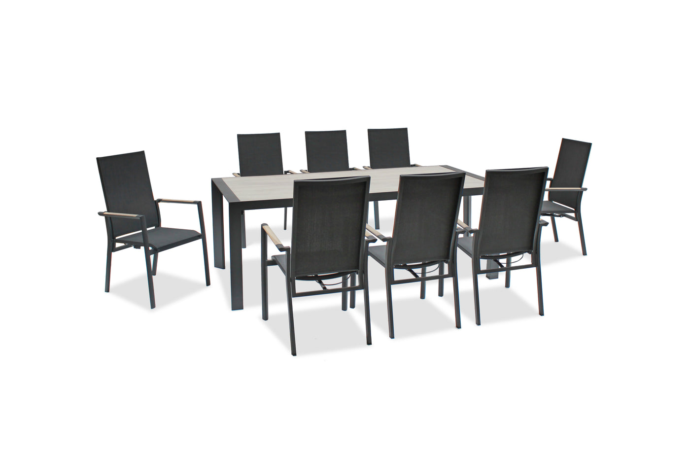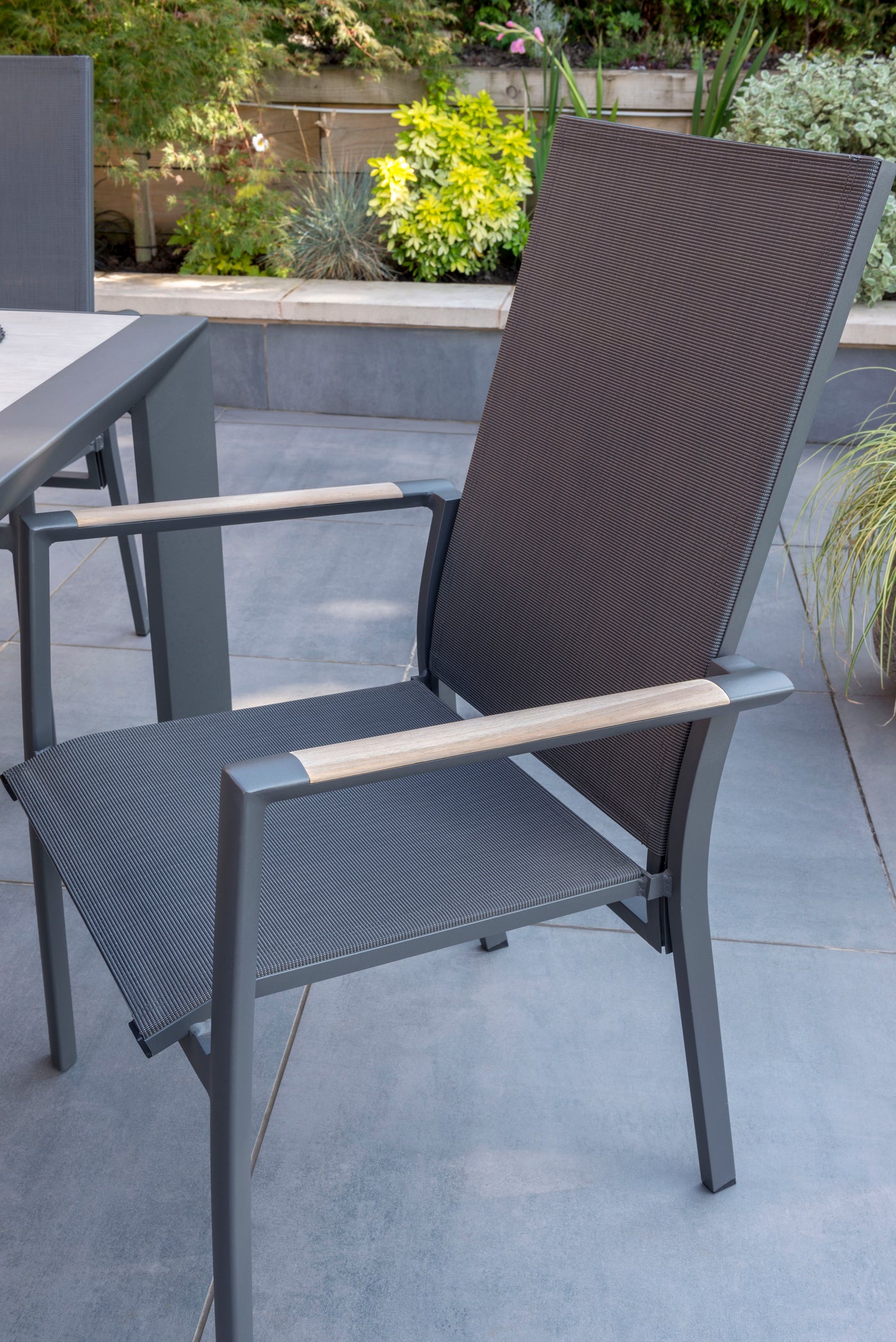The Surf Dining Set brings together modern elegance and exceptional comfort, making it the perfect choice for your outdoor dining area. This set includes Surf Active Multi-Position Dining Chairs and a spacious Surf Active Dining Table, designed to seat up to 8 people. With its lightweight, powder-coated aluminium frame and bouncy Textile Sling seat and back, the chairs provide long-lasting comfort without the need for cushions. The FSC® certified teak wood slats on the armrests add a touch of natural beauty, while the multi-position reclining feature ensures maximum relaxation.