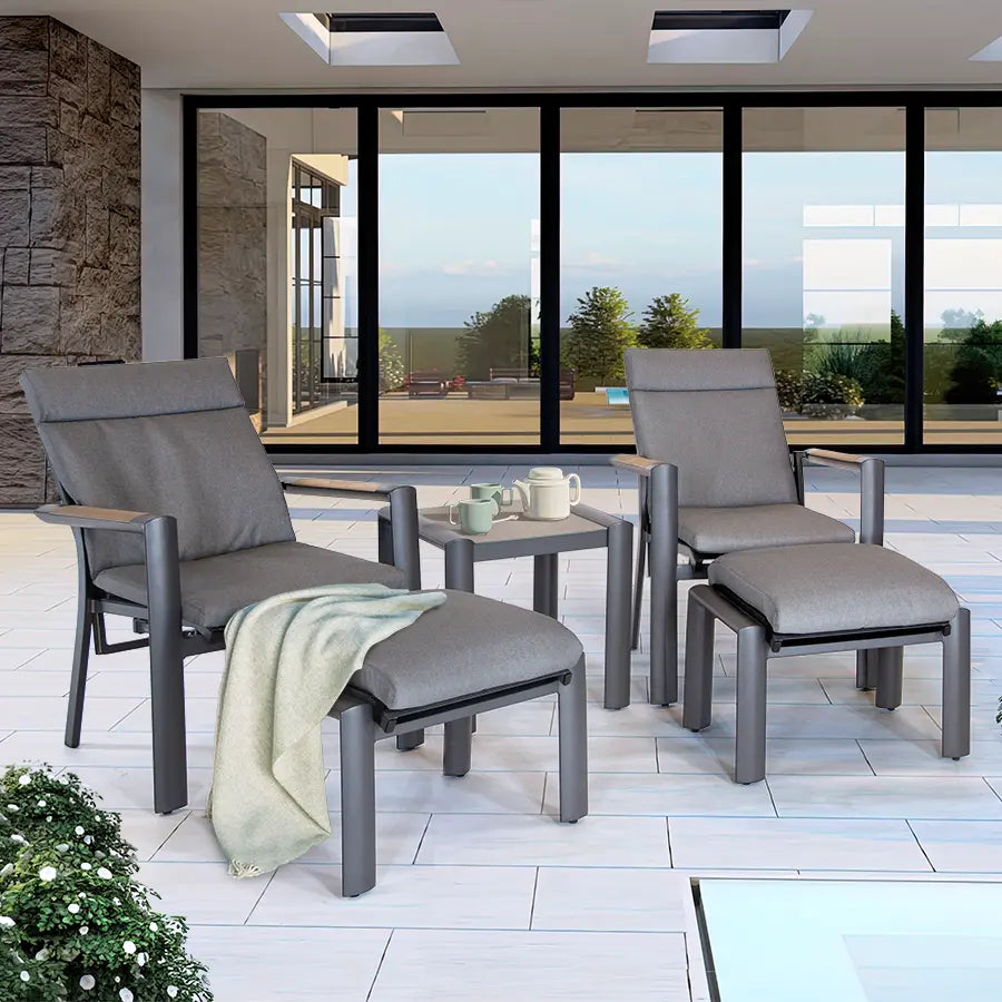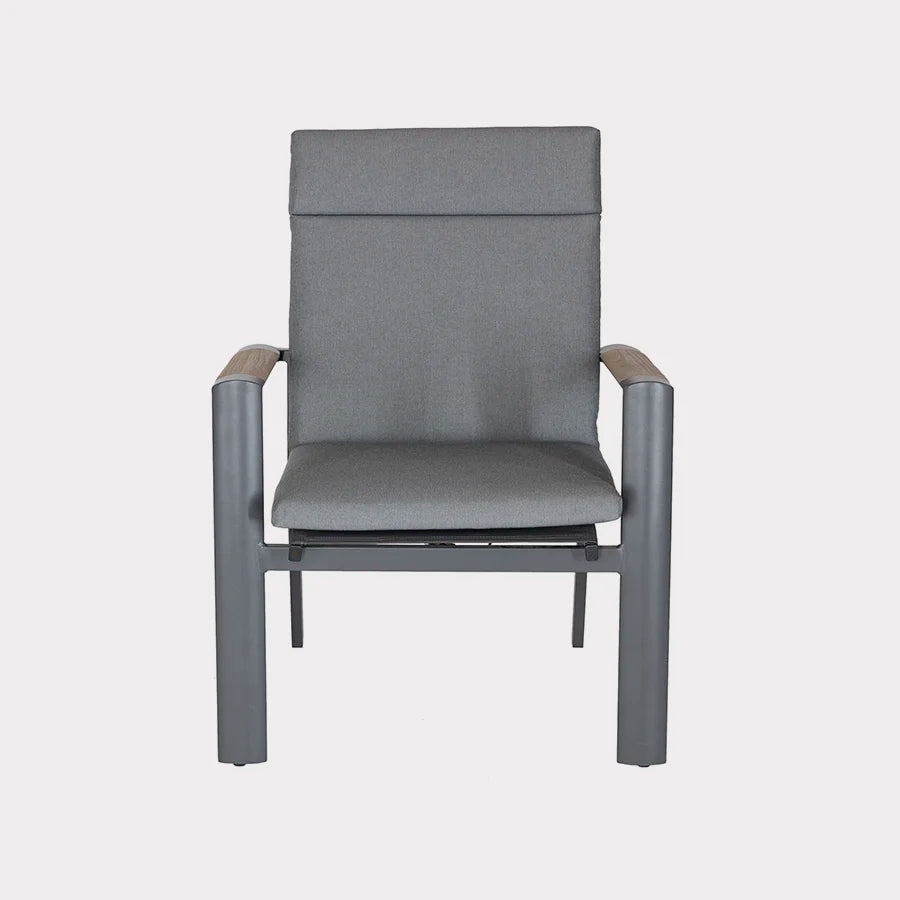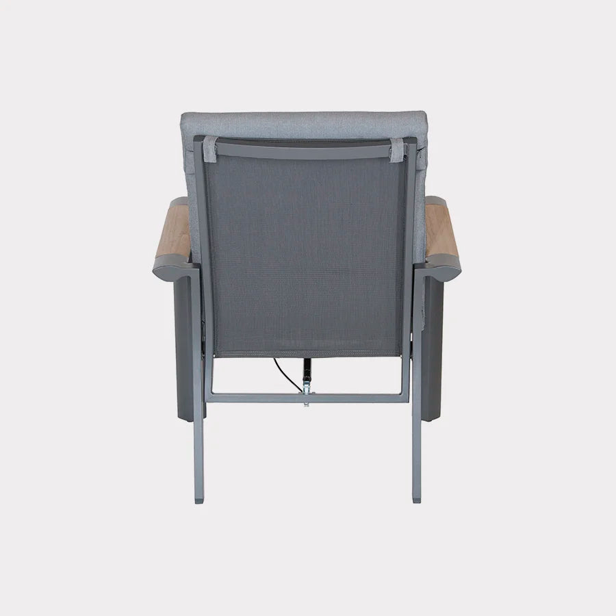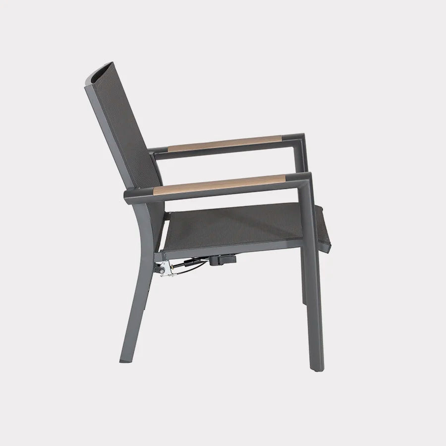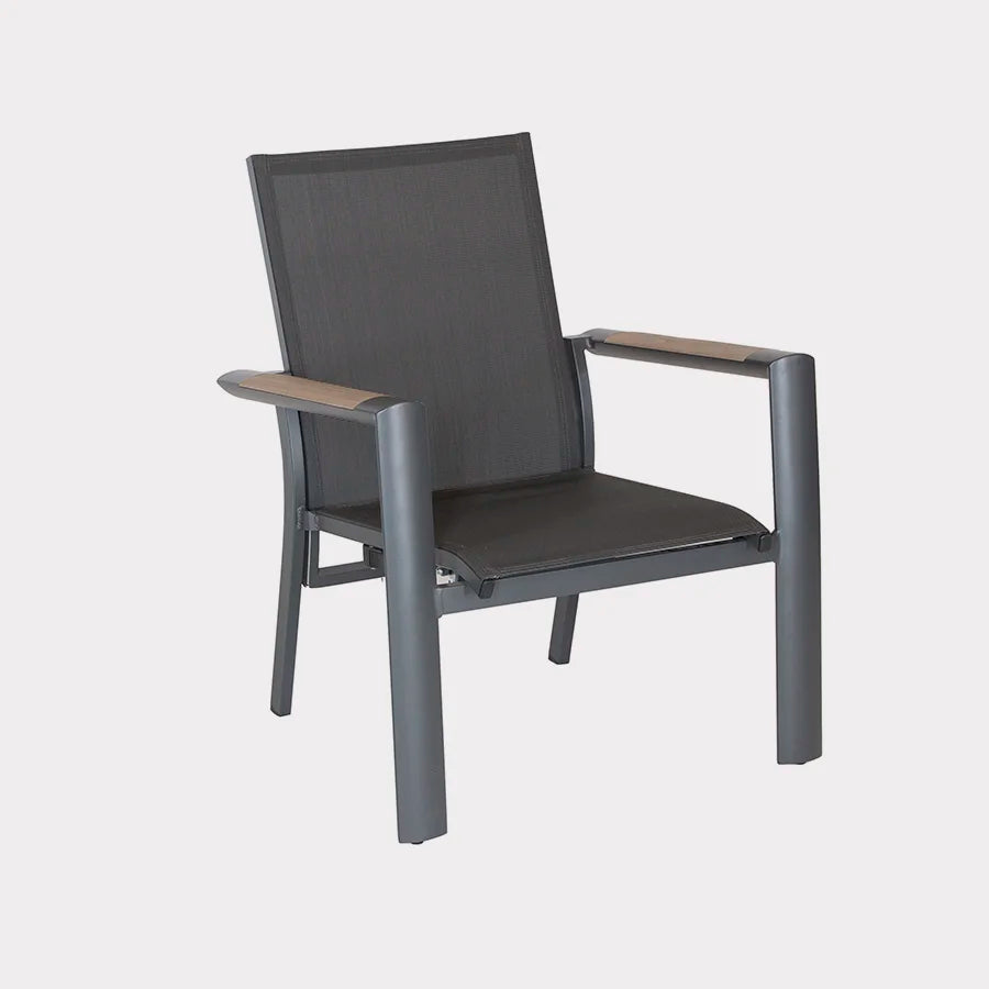 • It features an iron grey colour aluminium frame with grey textile sling (known as Textilene) seating and back and teak FSC certified armrests.