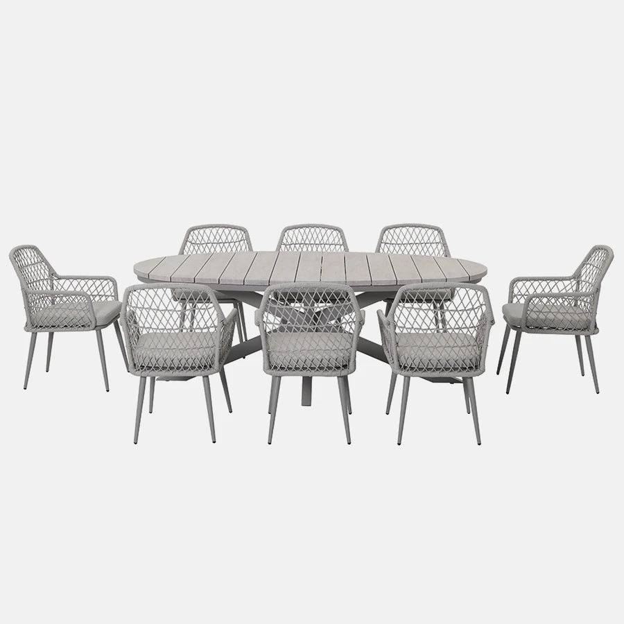 Transform your outdoor space into an elegant dining retreat with the Toulon 8-Seat Dining Set. Crafted with both style and comfort in mind, this set features a fresh new pebble colour for 2025, making it a chic addition to any garden. The virtually maintenance-free aluminium frame is paired with a modern rope design for the seat and back, offering a sleek look and excellent durability. The centrepiece of the set is the driftwood-effect aluminium table, boasting a heat transfer finish that adds a natural, rustic touch while ensuring resilience against the elements.