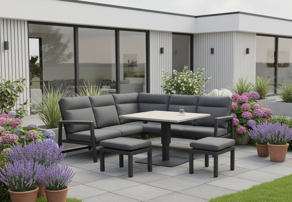 The set includes a compact corner sofa, two coordinating footstools and a square high/low table, offering flexibility for both lounging and dining. Whether you’re enjoying a casual coffee or gathering friends for a meal, the adjustable table moves smoothly between heights using a simple lever, with no fixed presets to limit how you use the space.
